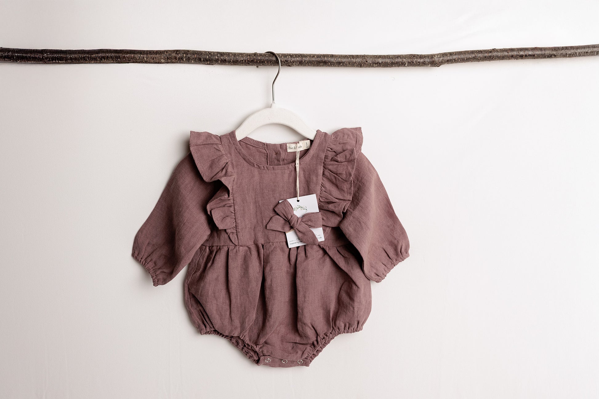 The Gabriella long-sleeved linen romper is an elegant ruffle collar romper made from 100% Linen and elegant wooden buttons on the back. The Gabriella romper is a 2pc set (romper & Bow)