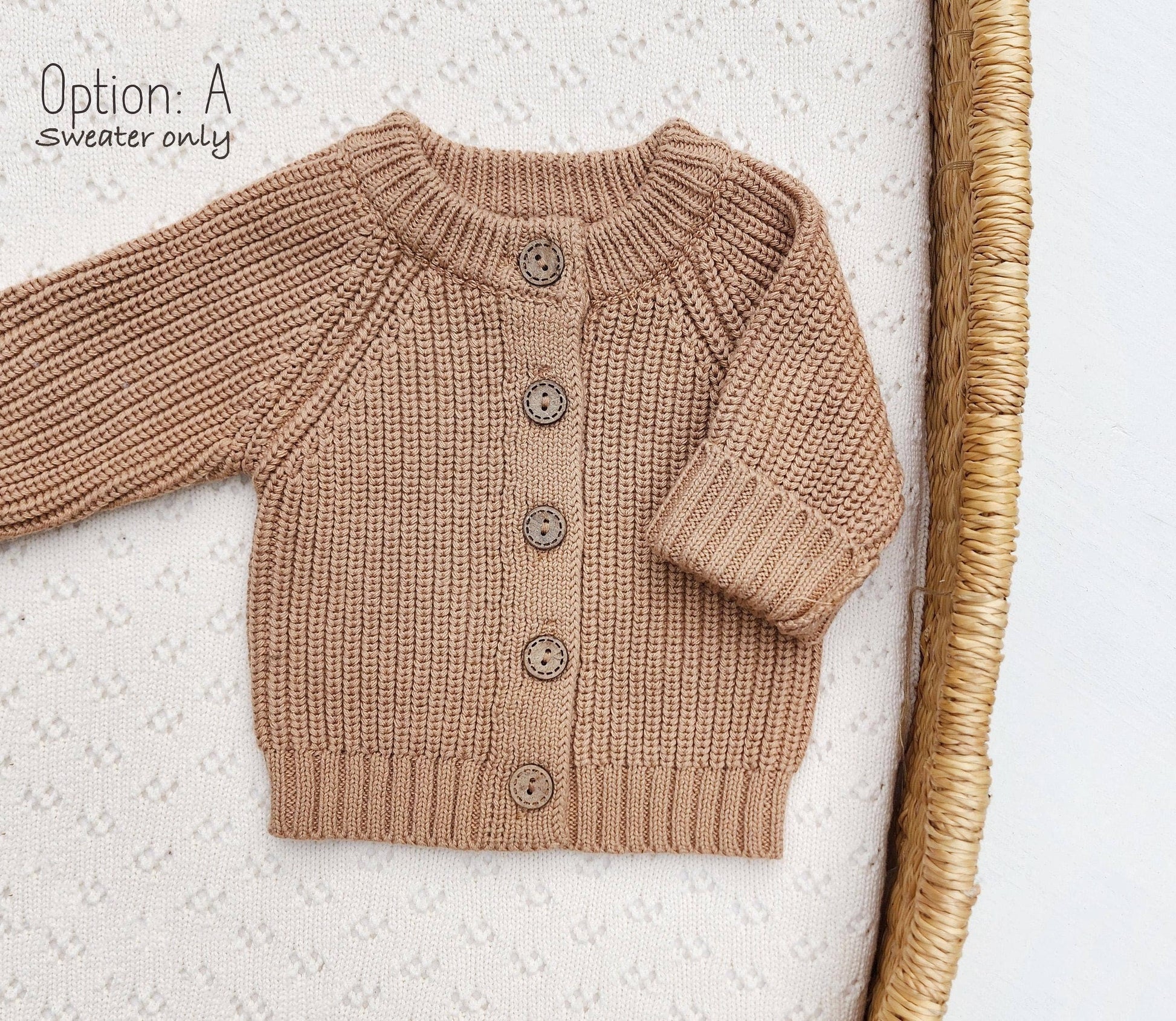 This beautiful gender neutral knit set is made from 100% cotton using Tan solid color yarn Option for this set are: Sweater + Bloomer + Booties (3pc set) Cozy Thick knit braided sweater cardigan with buttons Ribbed bloomers with draw strings Matching booties roll up/down cuff booties with draw strings. Perfect for: Take-home baby outfit Welcome home outfit Newborn photography sessions